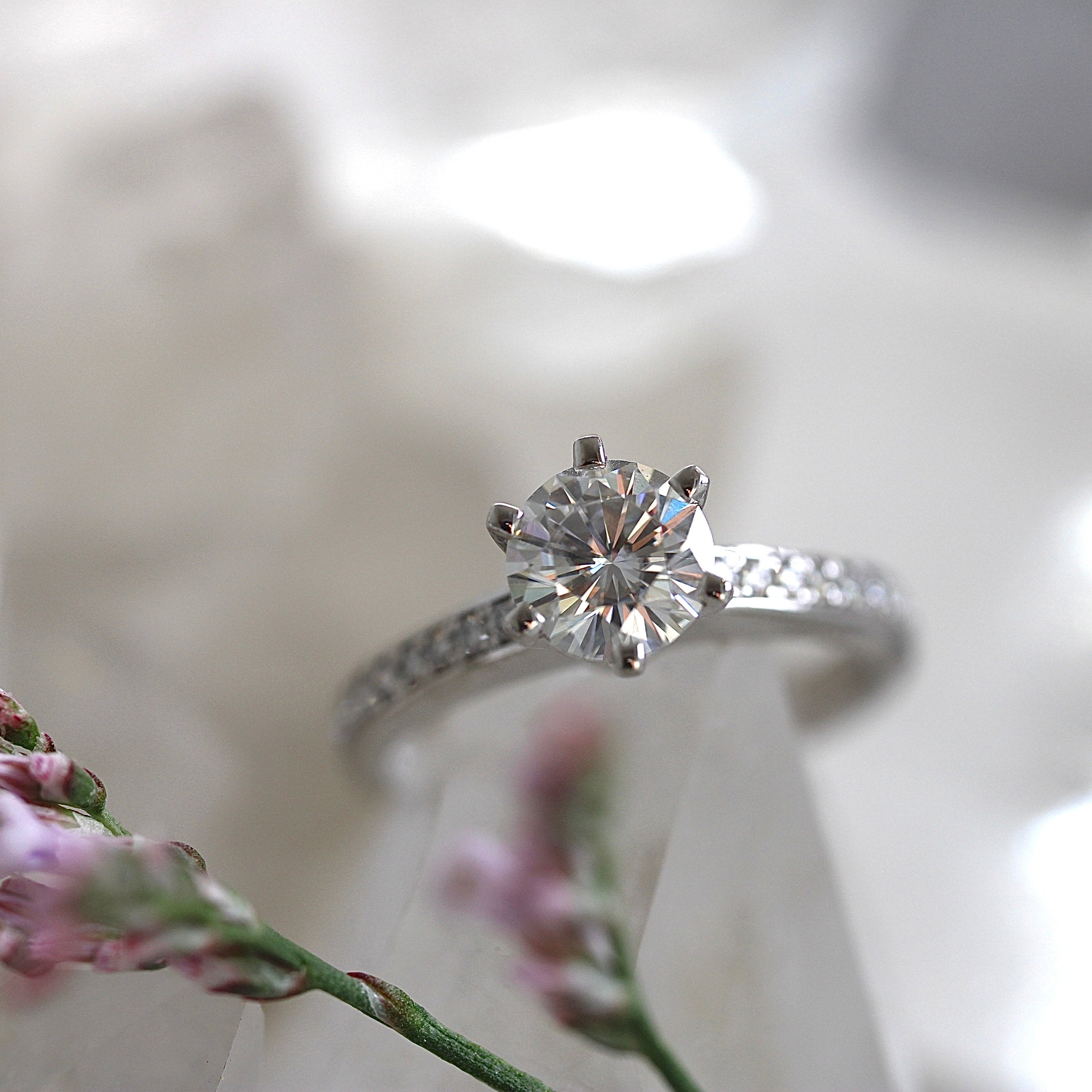 Ring with gemstones held against a blurred purple flower backgroundJewelry with gemstones on a blurred background