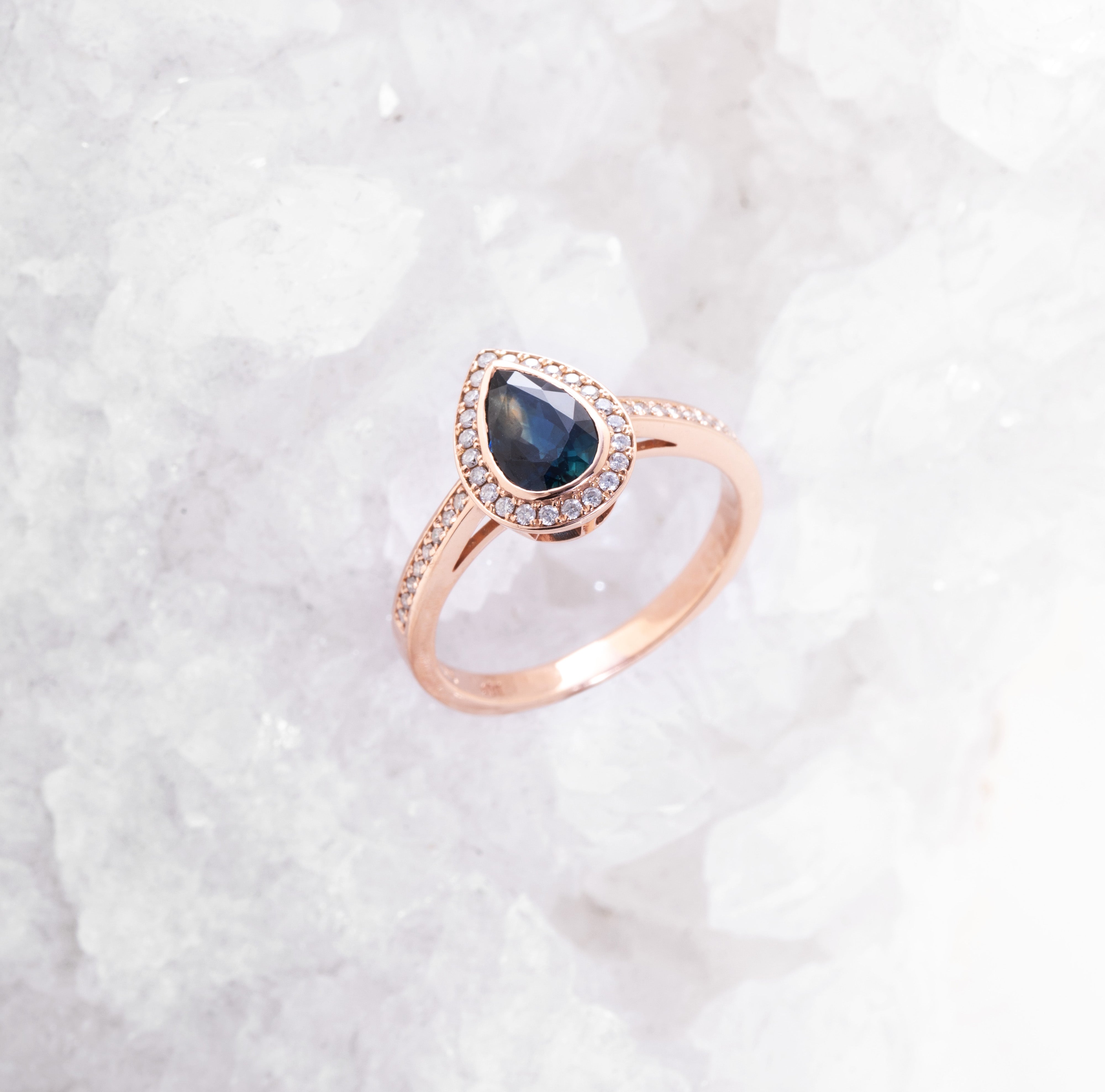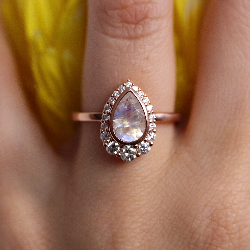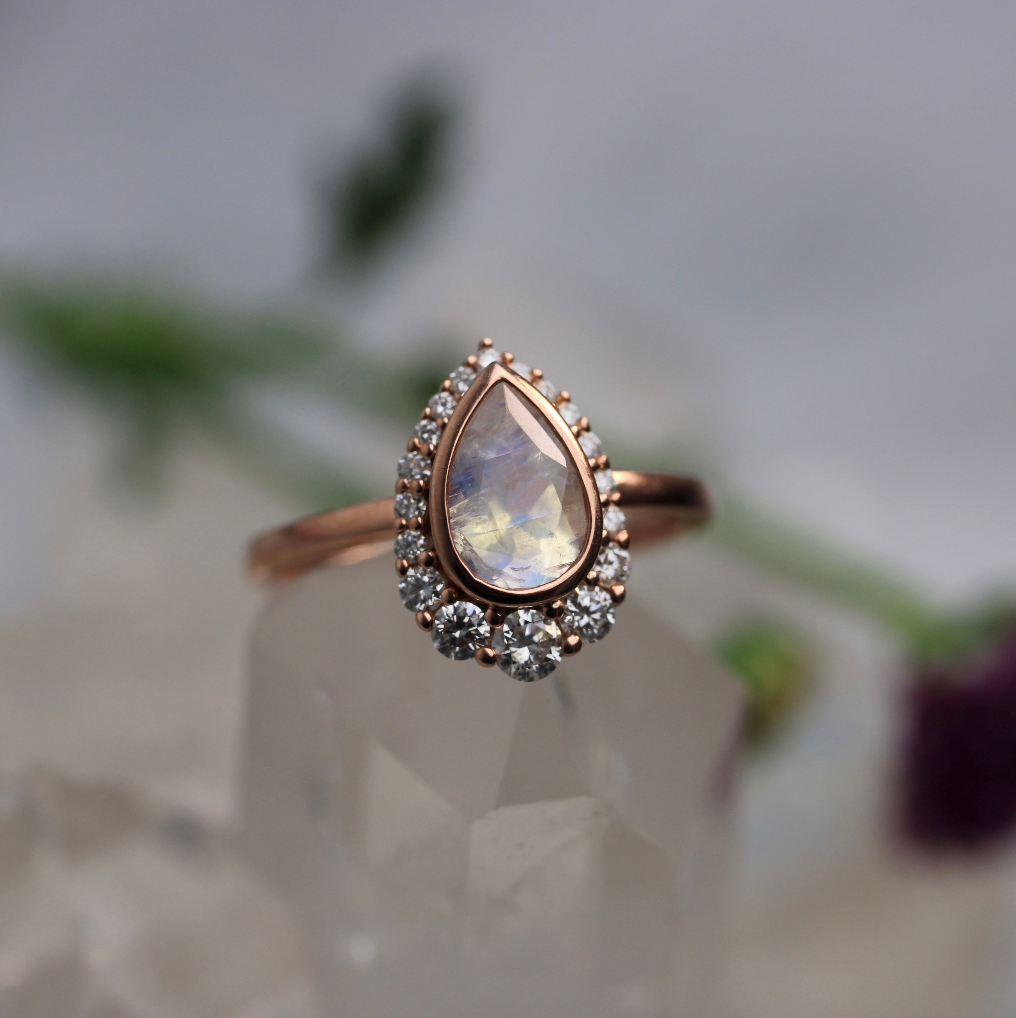 SALE - Pear Halo - Green Moissanite - Rose Gold - Ready to Ship