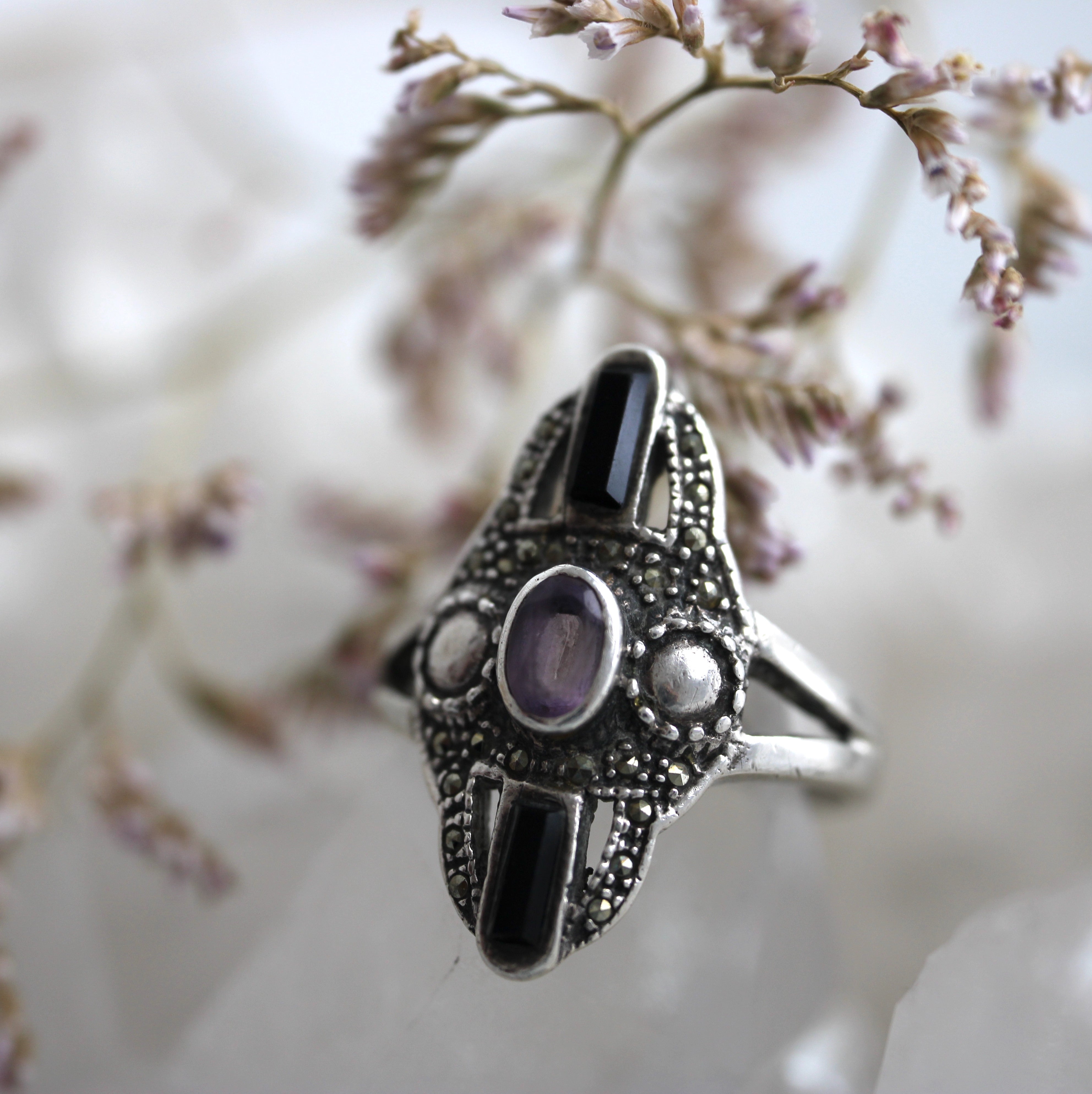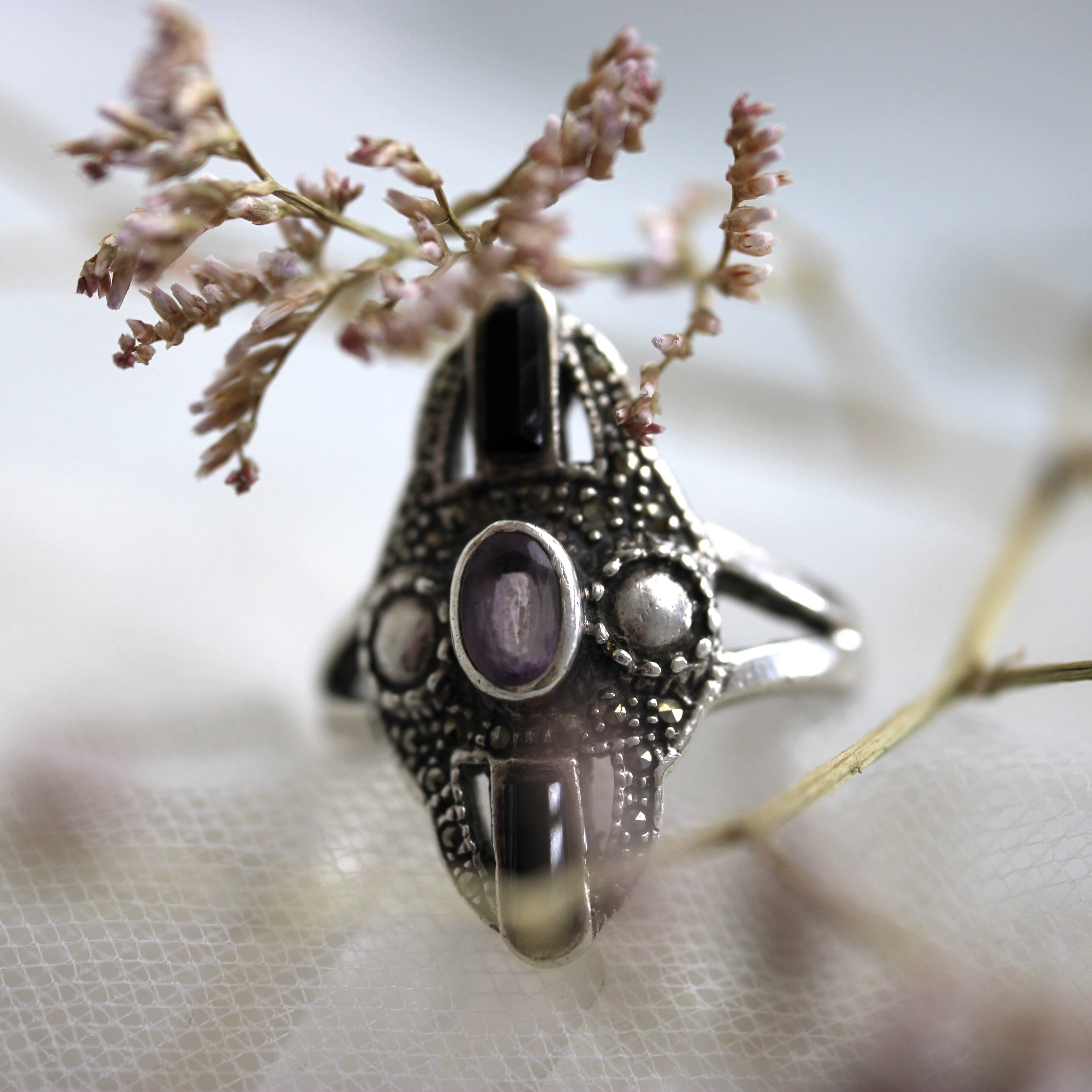 VINTAGE BIJOUX - Amethyst + Black Onyx Bohemian Ring