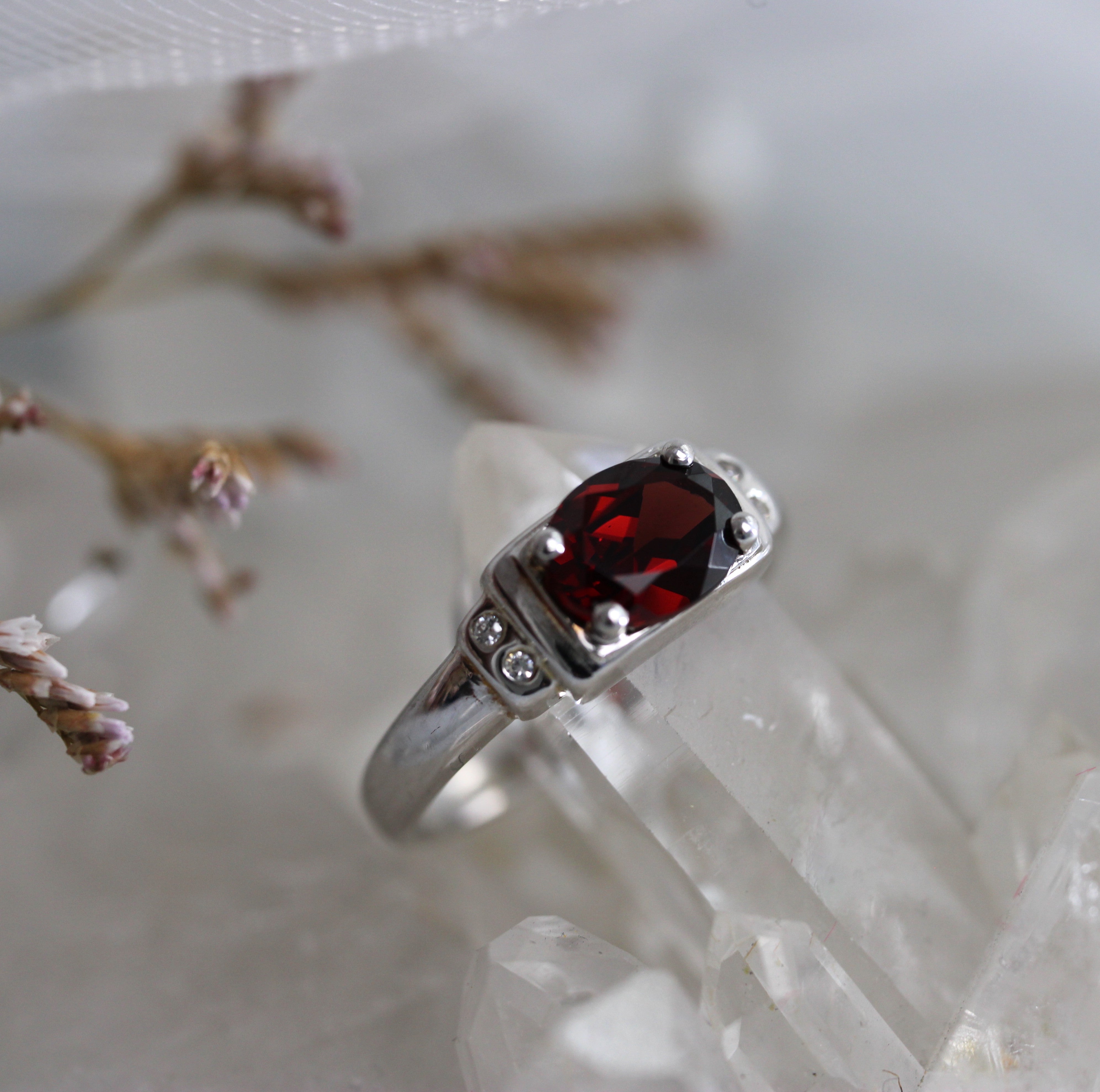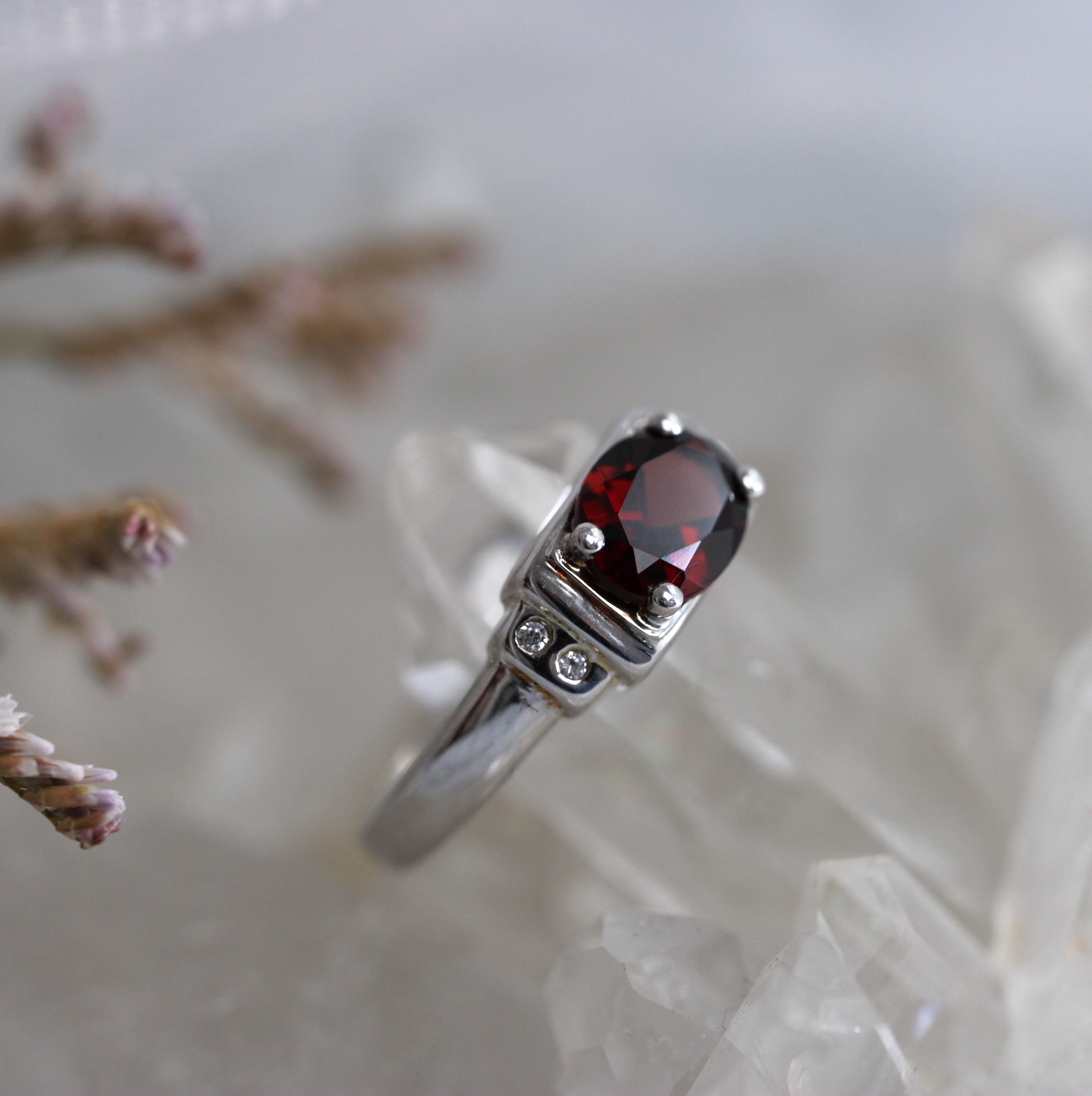 Compass Set Garnet Solitaire Ring - Sterling Silver - Ready to Ship