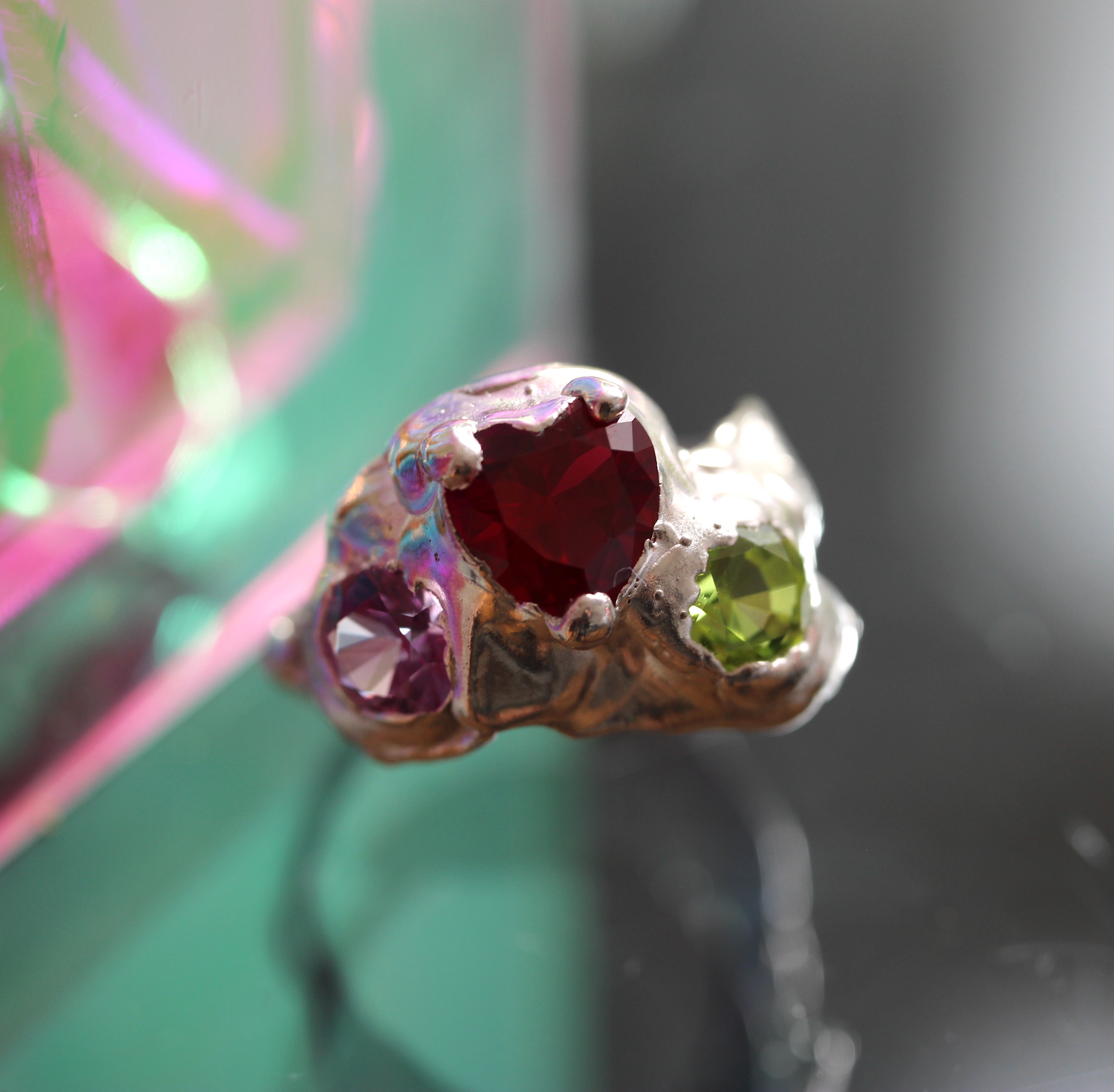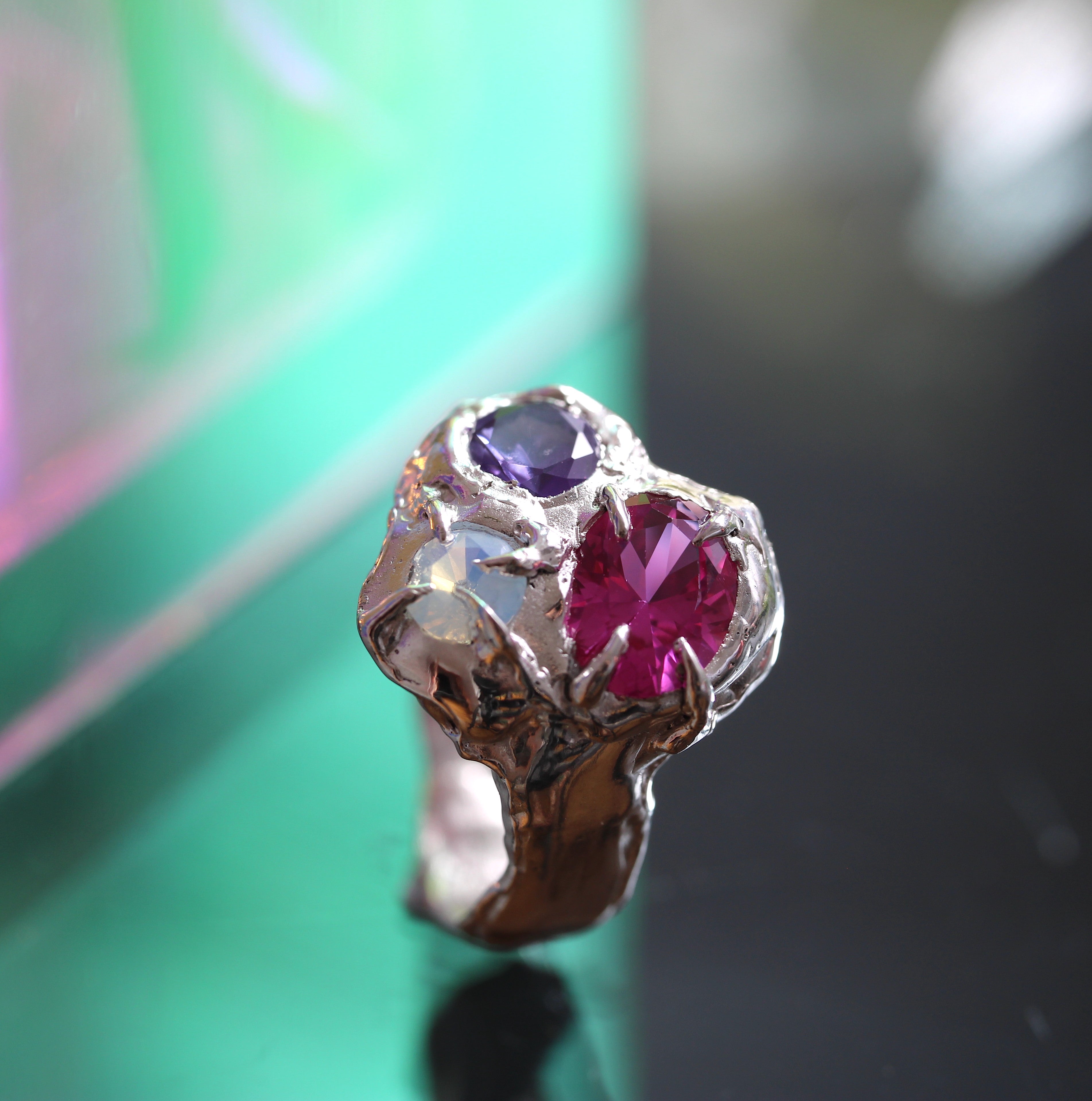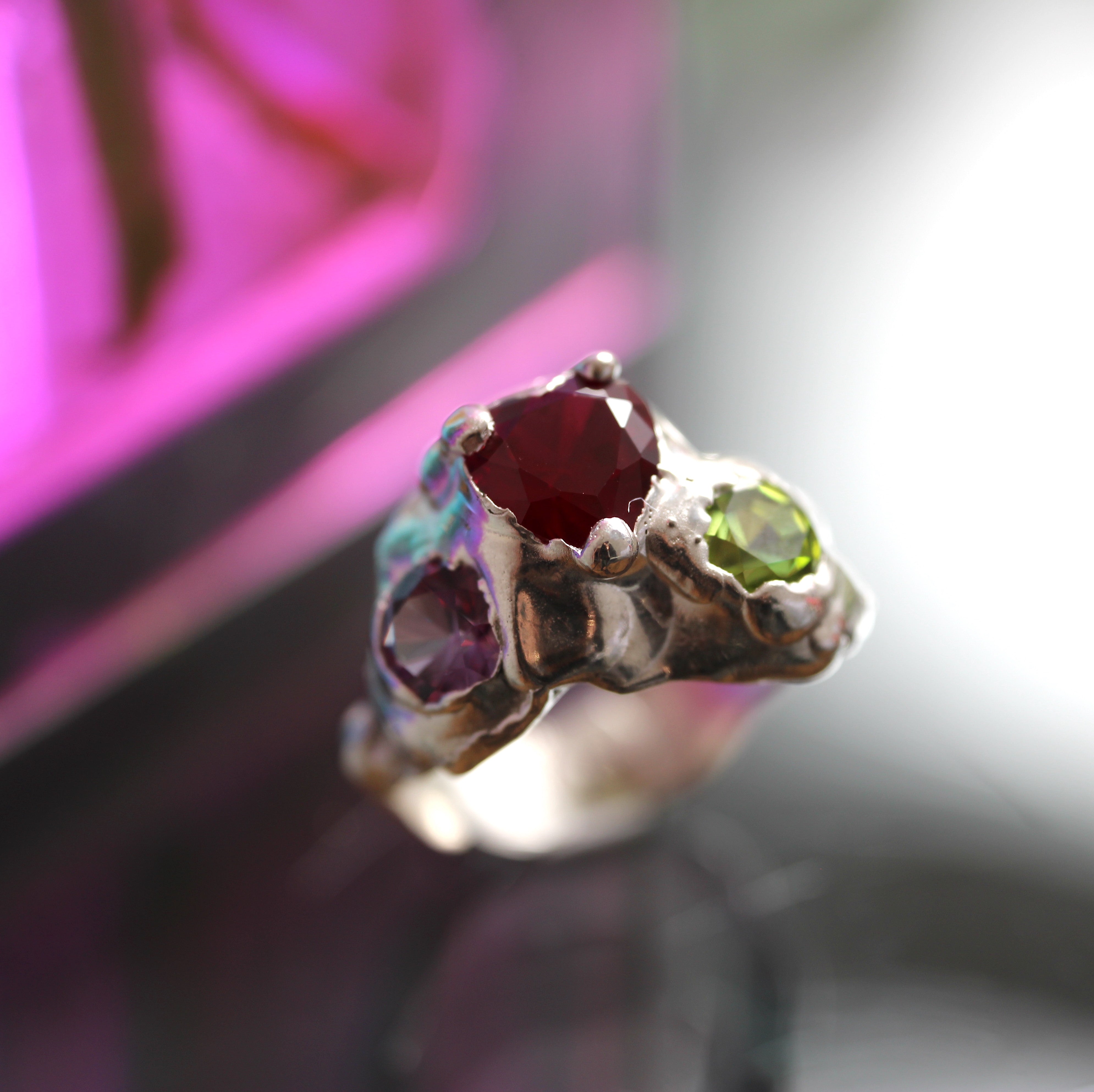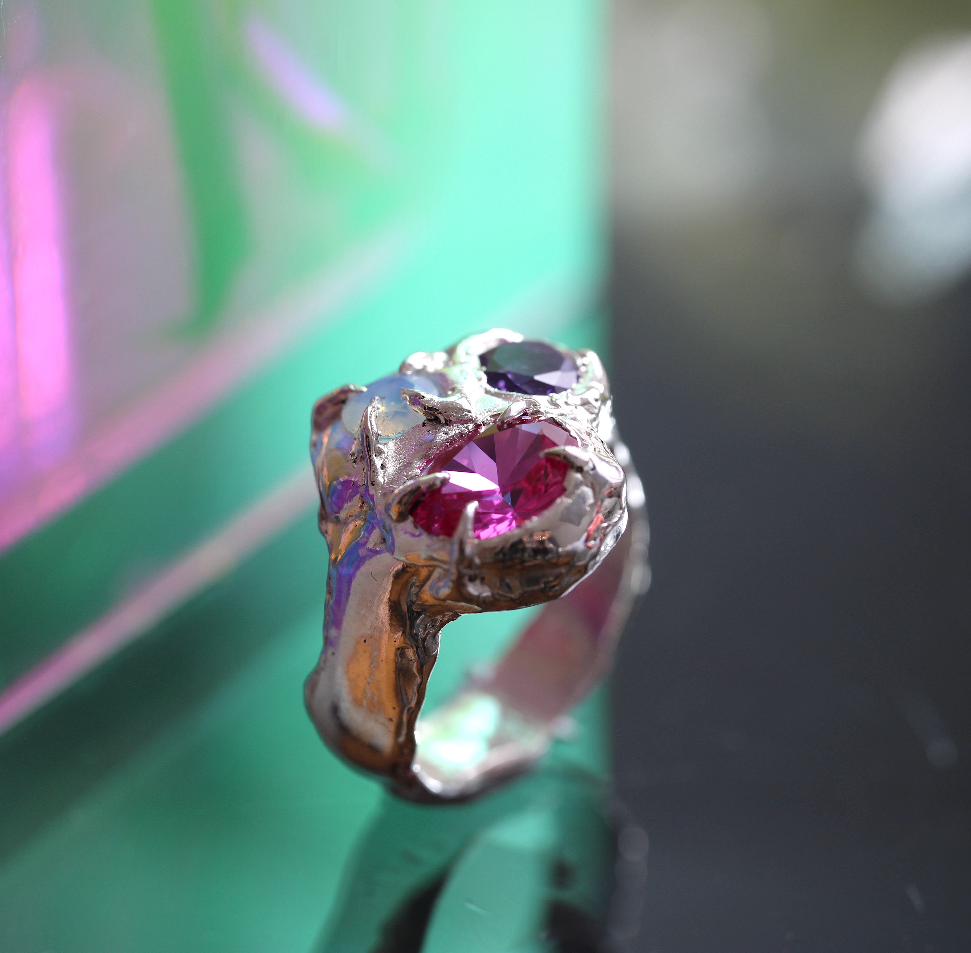 Silver ring with purple gemstones on a reflective surface with a blurred backgroundHandcrafted pink gemstone ring in sterling silver from the Juicebox Jewels collection by Windfall Jewellery