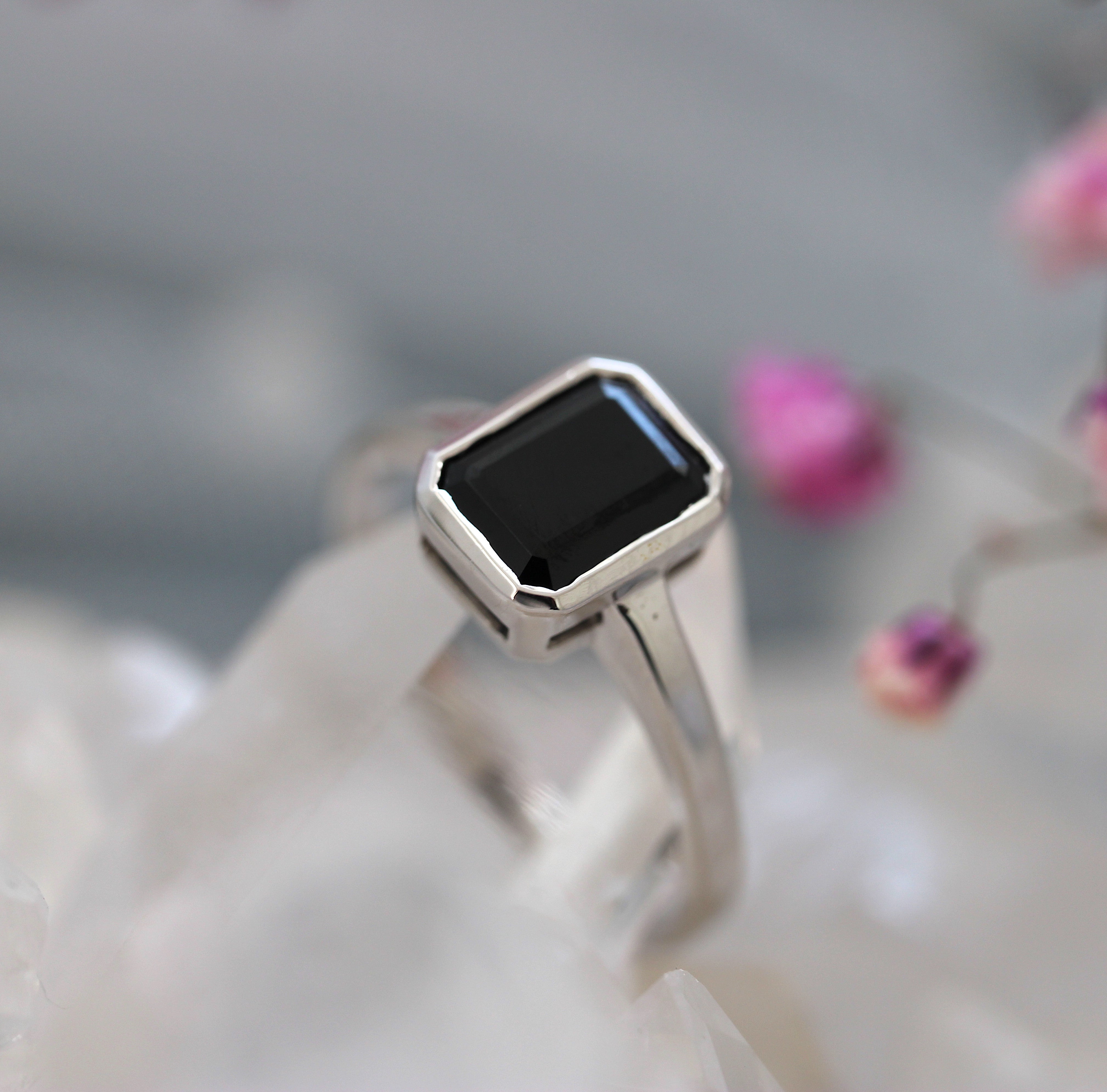 Black Tourmaline Emerald Cut Ring - Bezel Set - Ready to Ship